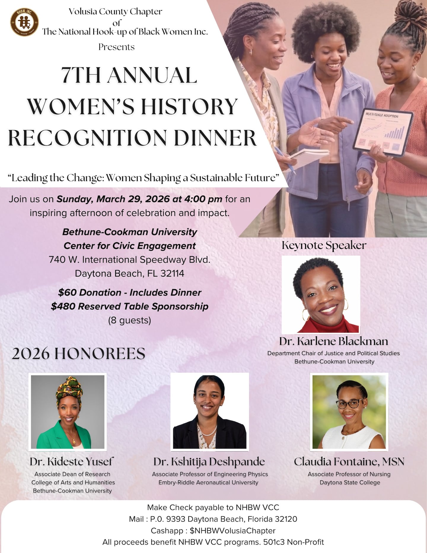 7th Annual Women’s History Recognition Dinner Sun Mar 29, 2026, 4pm, BCU Center for Civic Engagement-740 W, International Speedway Blvd., Daytona Beach