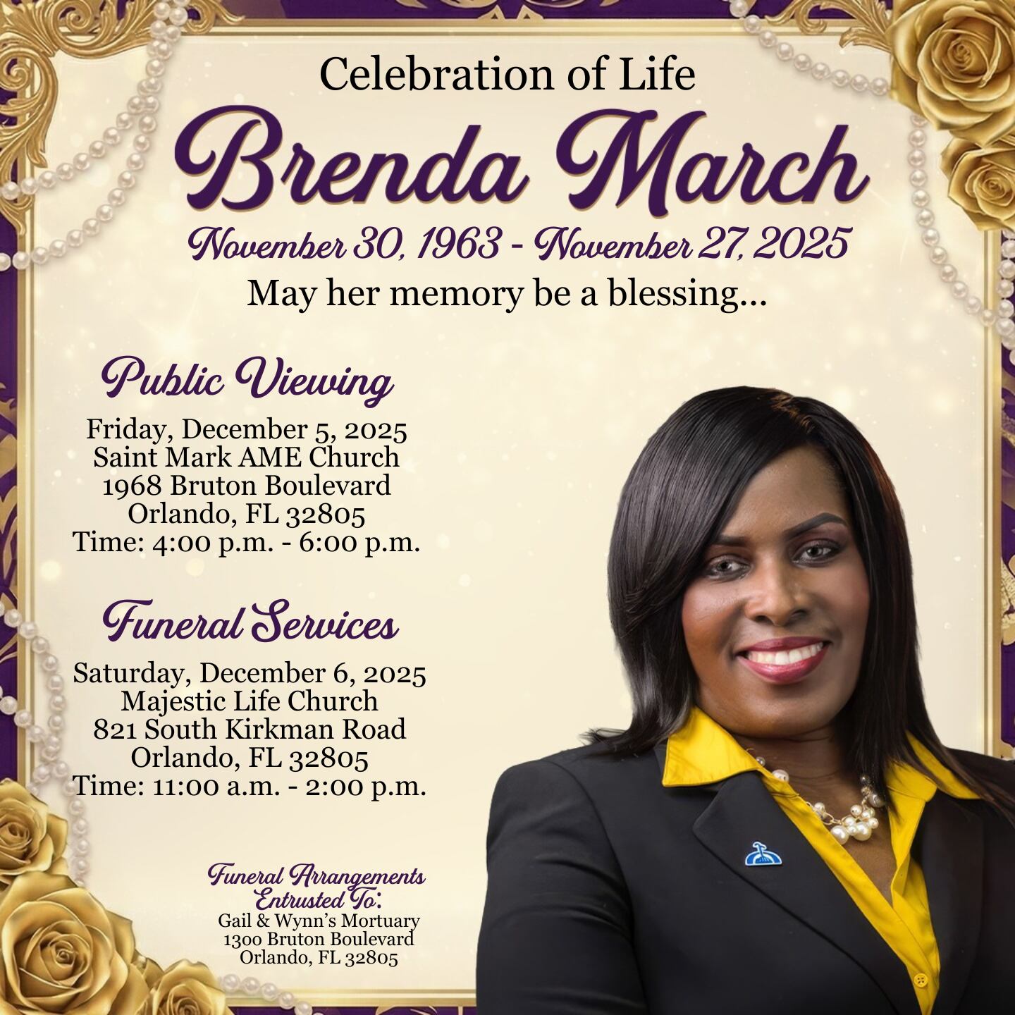 Funeral services for our beloved Brenda March, Sat, Dec 6th, 11am-2pm at Majestic Life Church, 821 S. Kirkman Rd, Orlando