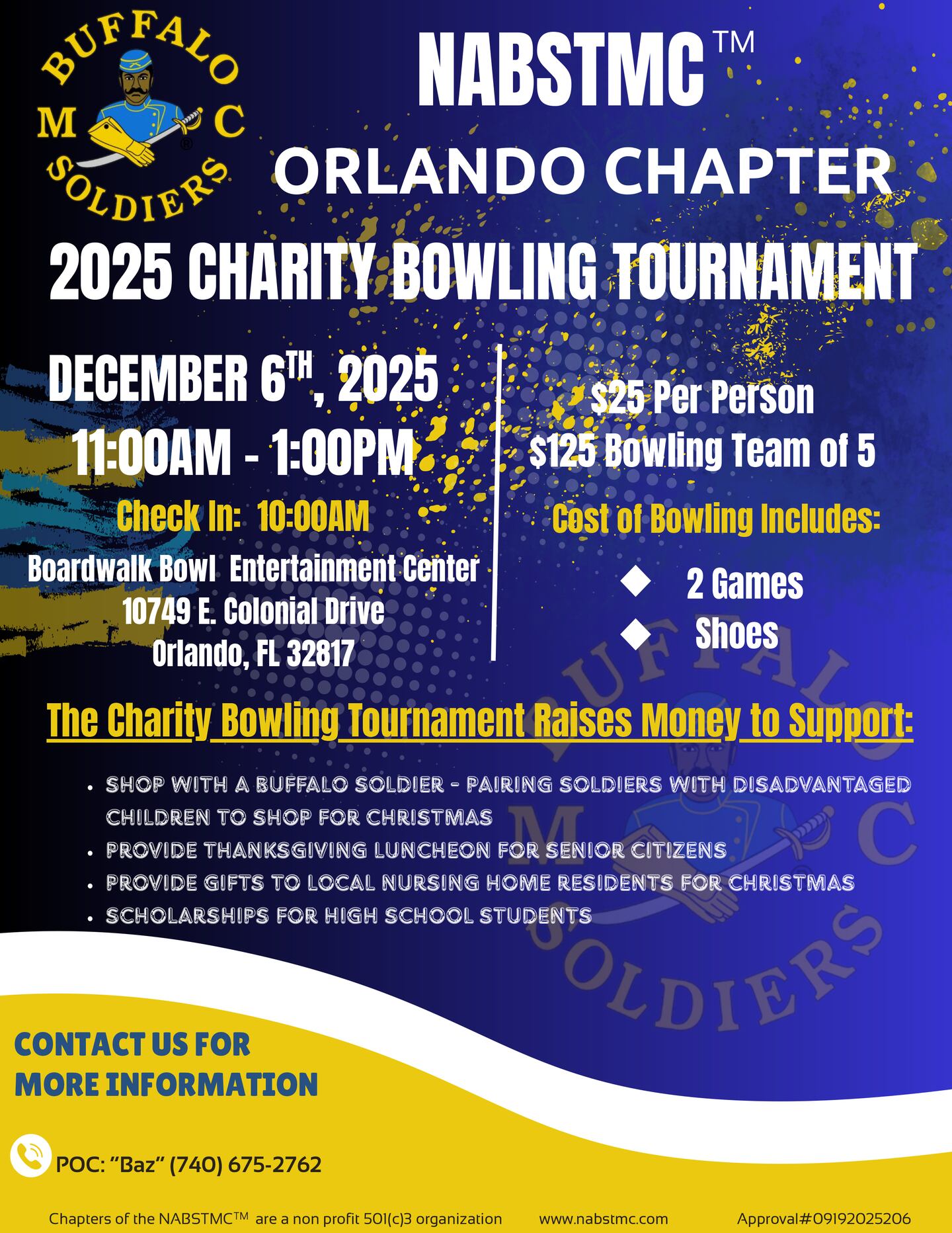 Orlando Chapter Buffalo Soldiers Motorcycle Club’s 2025 Charity Bowling Tournament is Sat, Dec 6th, 11am-1pm, Boardwalk Bowl Entertainment Center-10749 E. Colonial Dr, Orlando