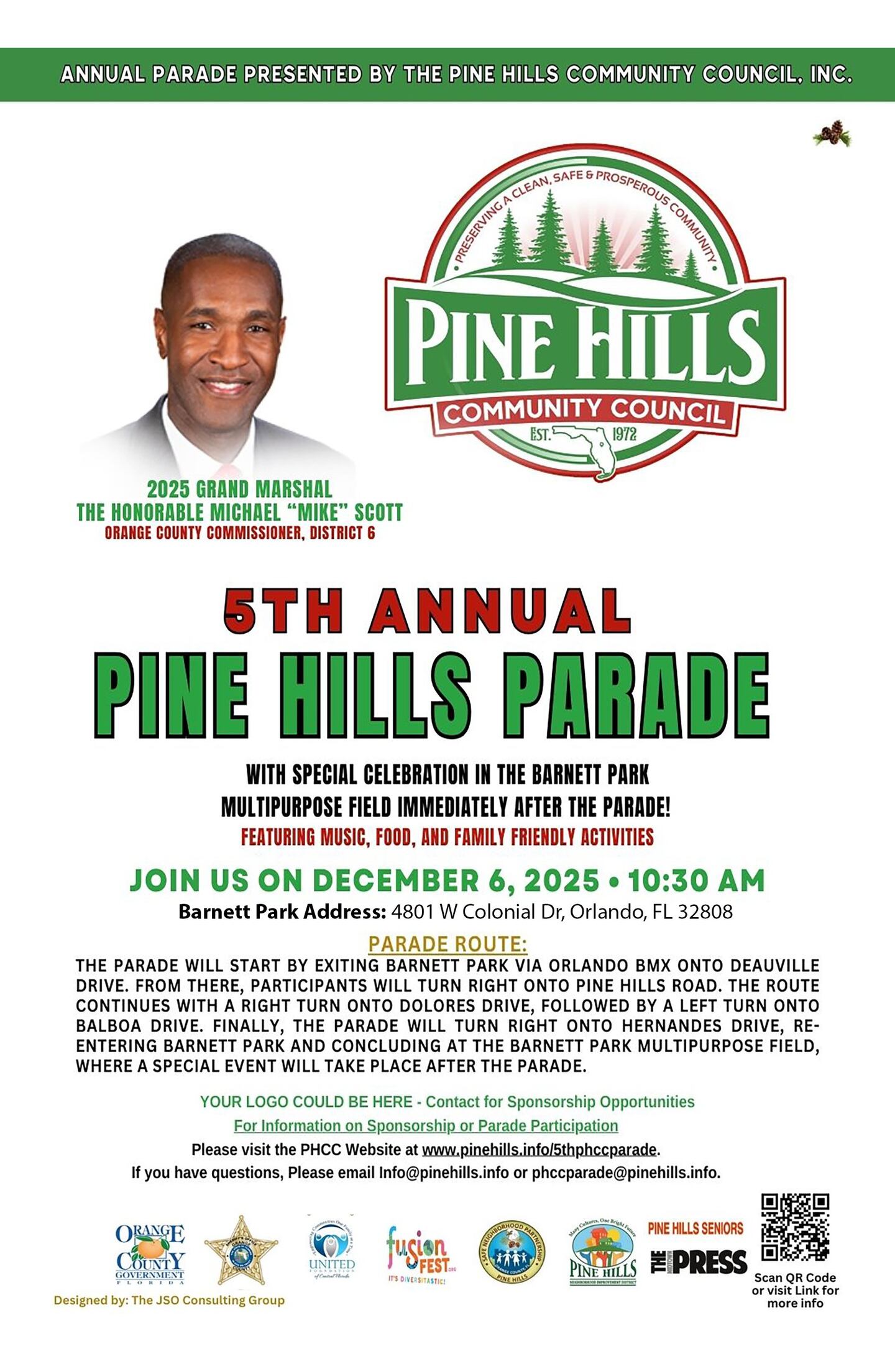 5th Annual Pine Hills Parade and celebration, Sat, Dec 6th, 10:30am at Barnett Park-4801 W. Colonial Dr. Orlando