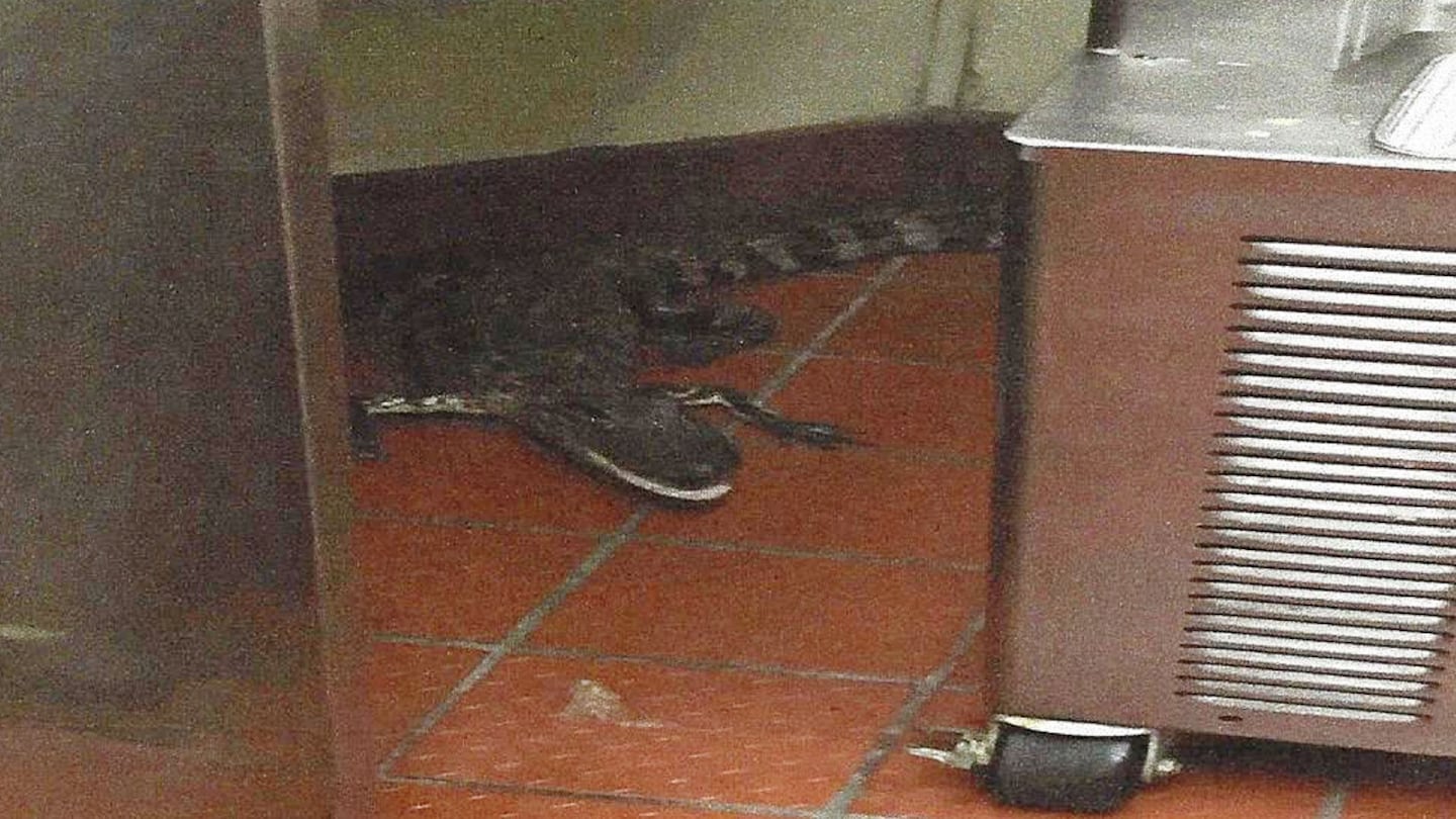 This photo shows an alligator in the kitchen of a Wendy's Restaurant in Loxahatchee, Fla. Officials say 24-year-old Joshua James threw a 3.5-foot alligator through the drive-thru window. (Florida Fish and Wildlife Conservation Commission via AP)