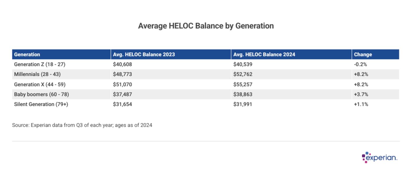 Generations that now comprise most of the workforce, millennials and Generation X, are tapping more of their home equity than others by a significant margin. That's not an especially surprising detail, as HELOC financing terms generally require a steady income and a decent amount of equity. Millennial and Gen X balances both grew by 8.2% in 2024, and both generations' average balances exceeded $50,000.