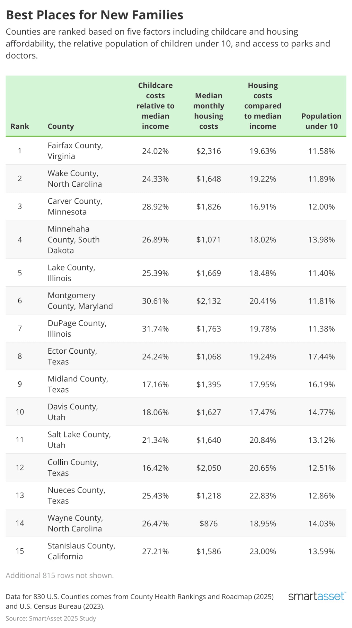 With this in mind, SmartAsset ranked 830 U.S. counties to identify the best places for new families, ranked based on affordability, available amenities and family-friendly demographics.