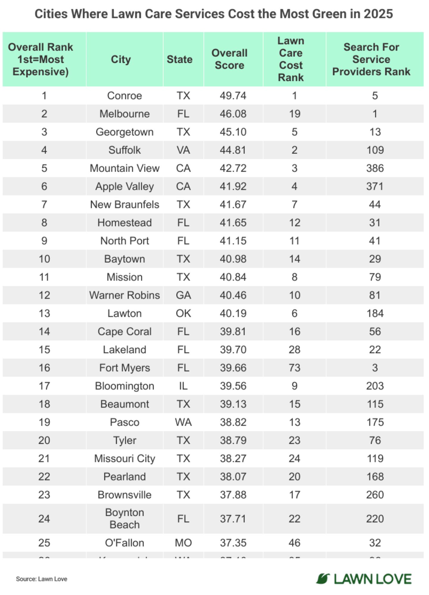 To find out, Lawn Love looked at six metrics across 460 of the biggest U.S. cities to rank the Cities Where Lawn Care Services Cost the Most Green in 2025.