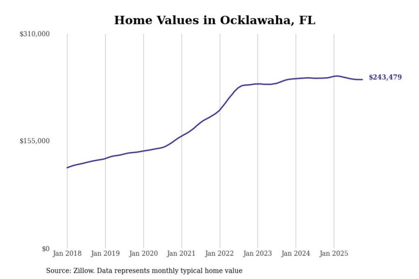 Stacker compiled a list of cities with the most expensive homes in the Ocala, FL metro area using data from Zillow. Charts show the monthly typical home value since January 2018.