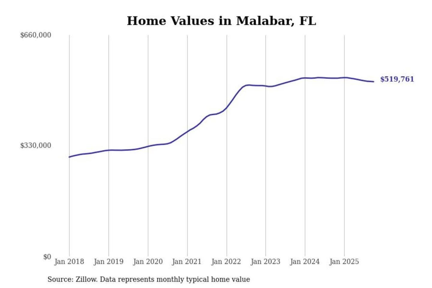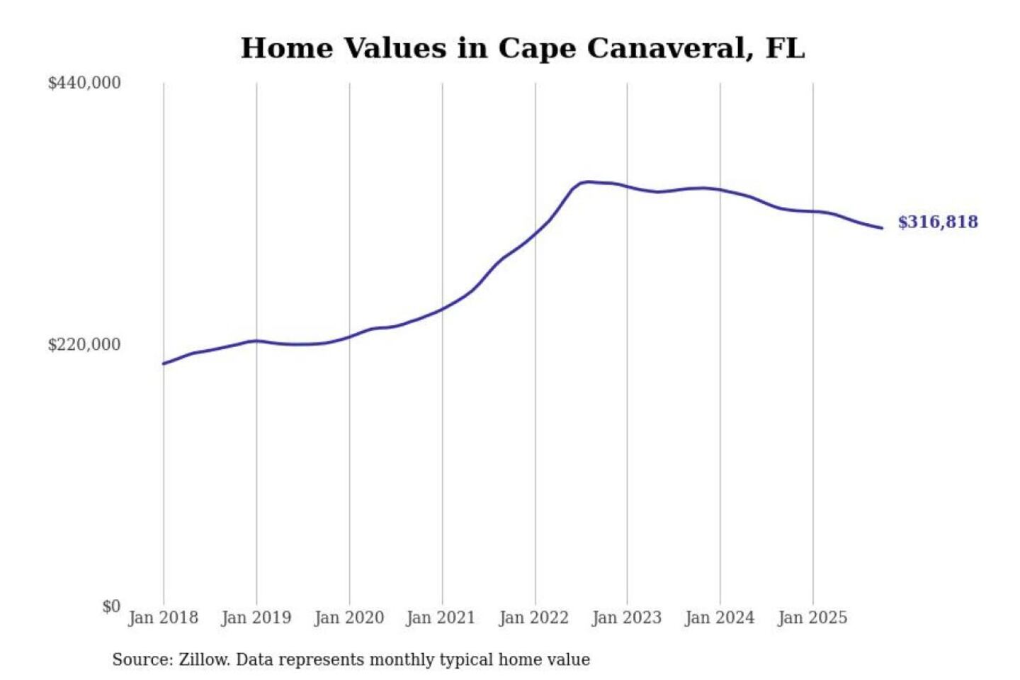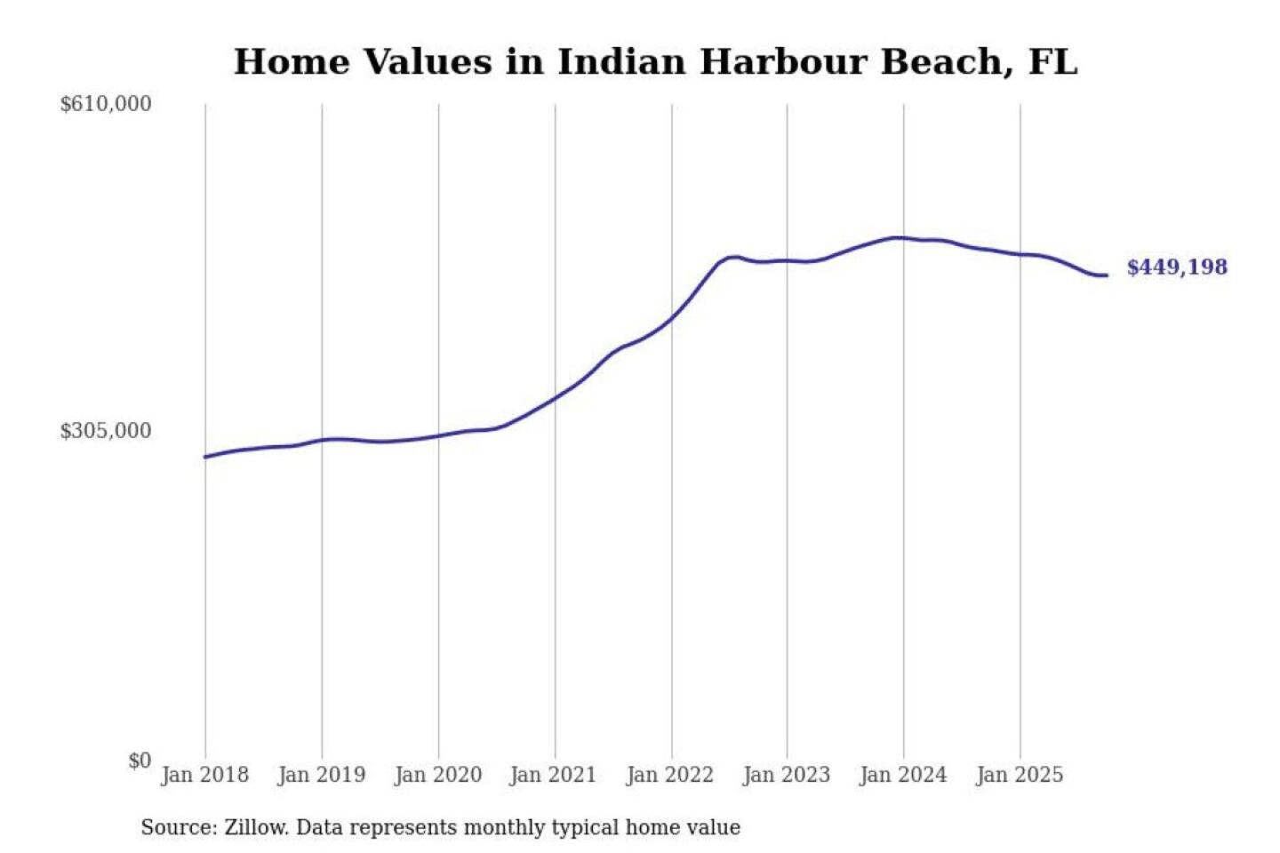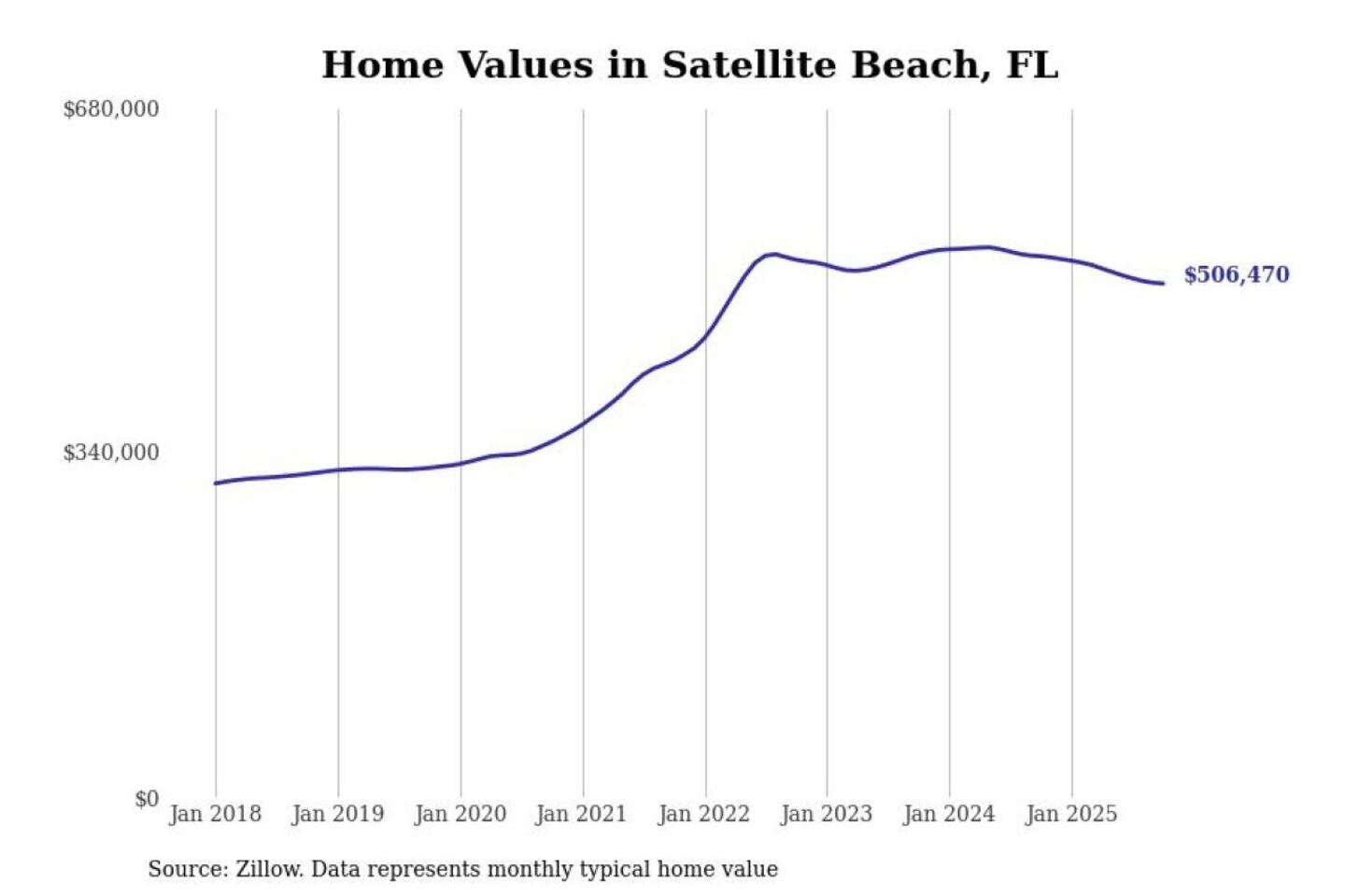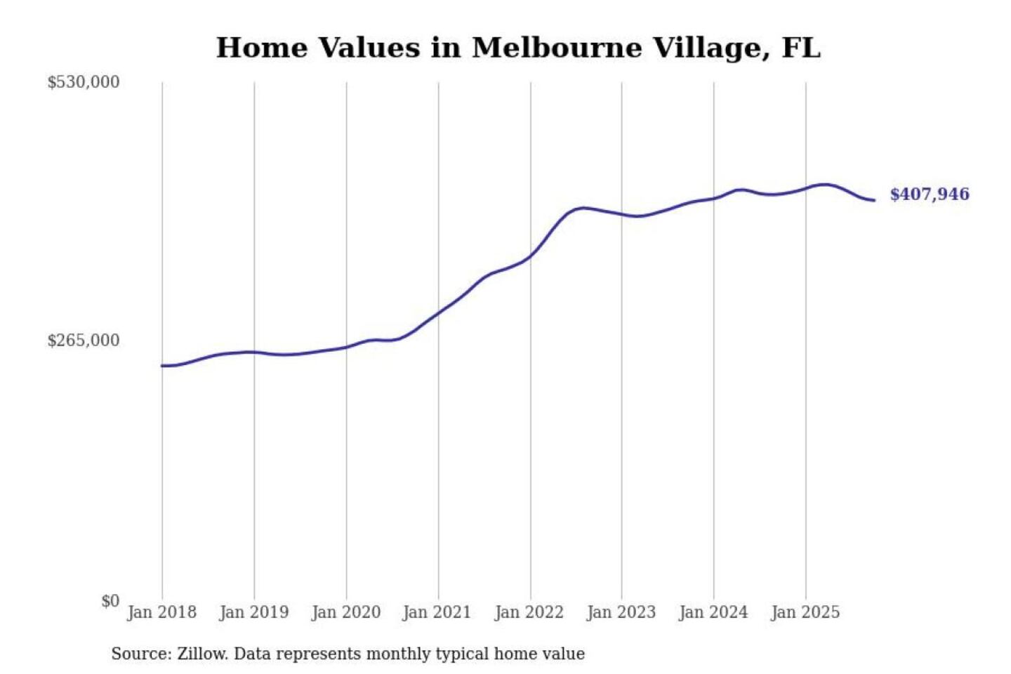 Stacker compiled a list of cities with the most expensive homes in the Palm Bay-Melbourne-Titusville, FL metro area using data from Zillow. Charts show the monthly typical home value since January 2018.