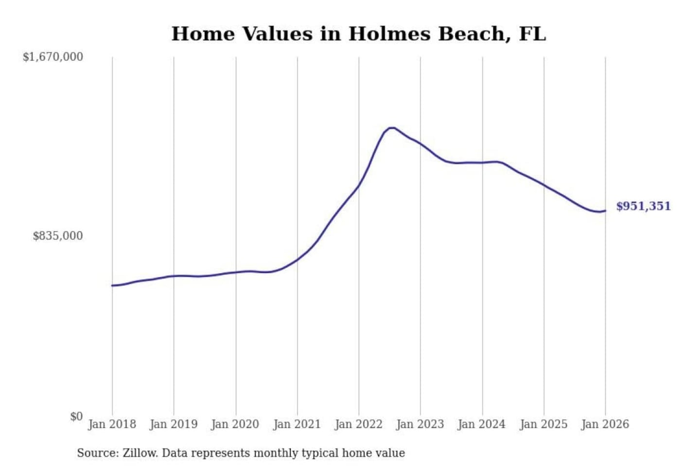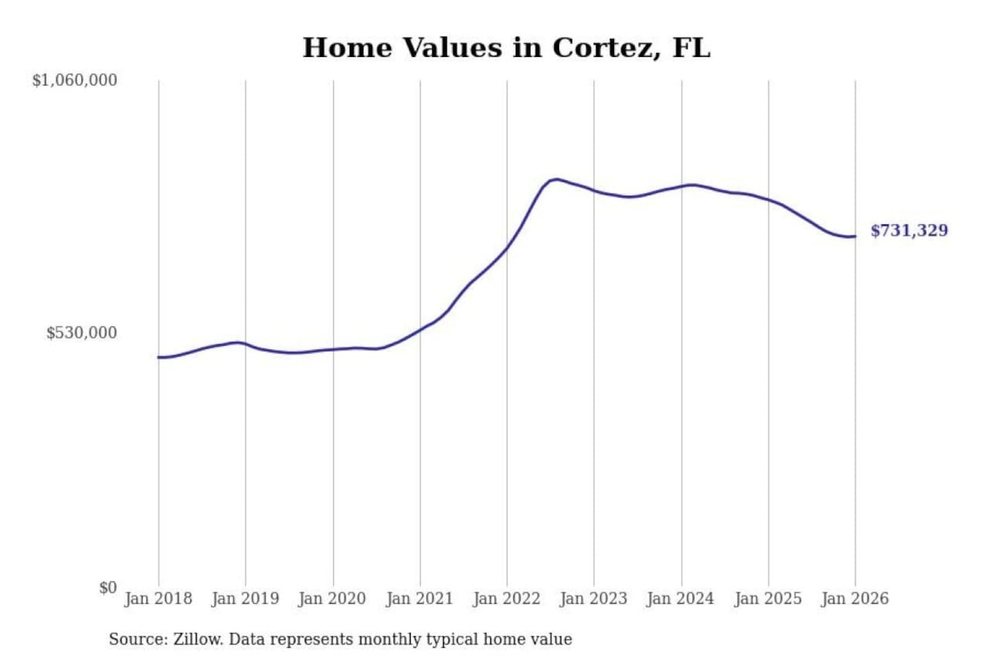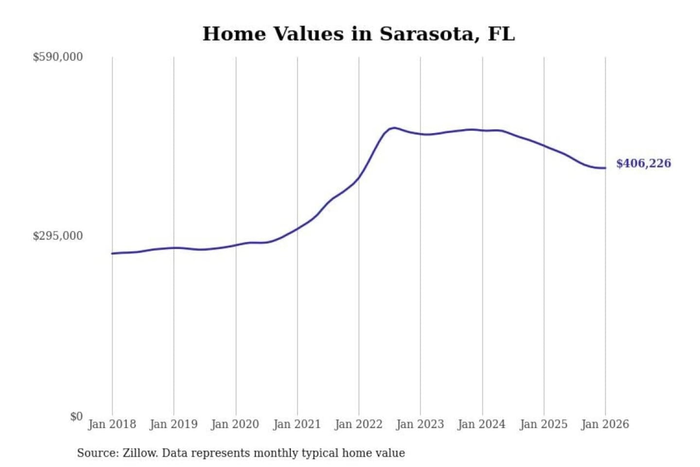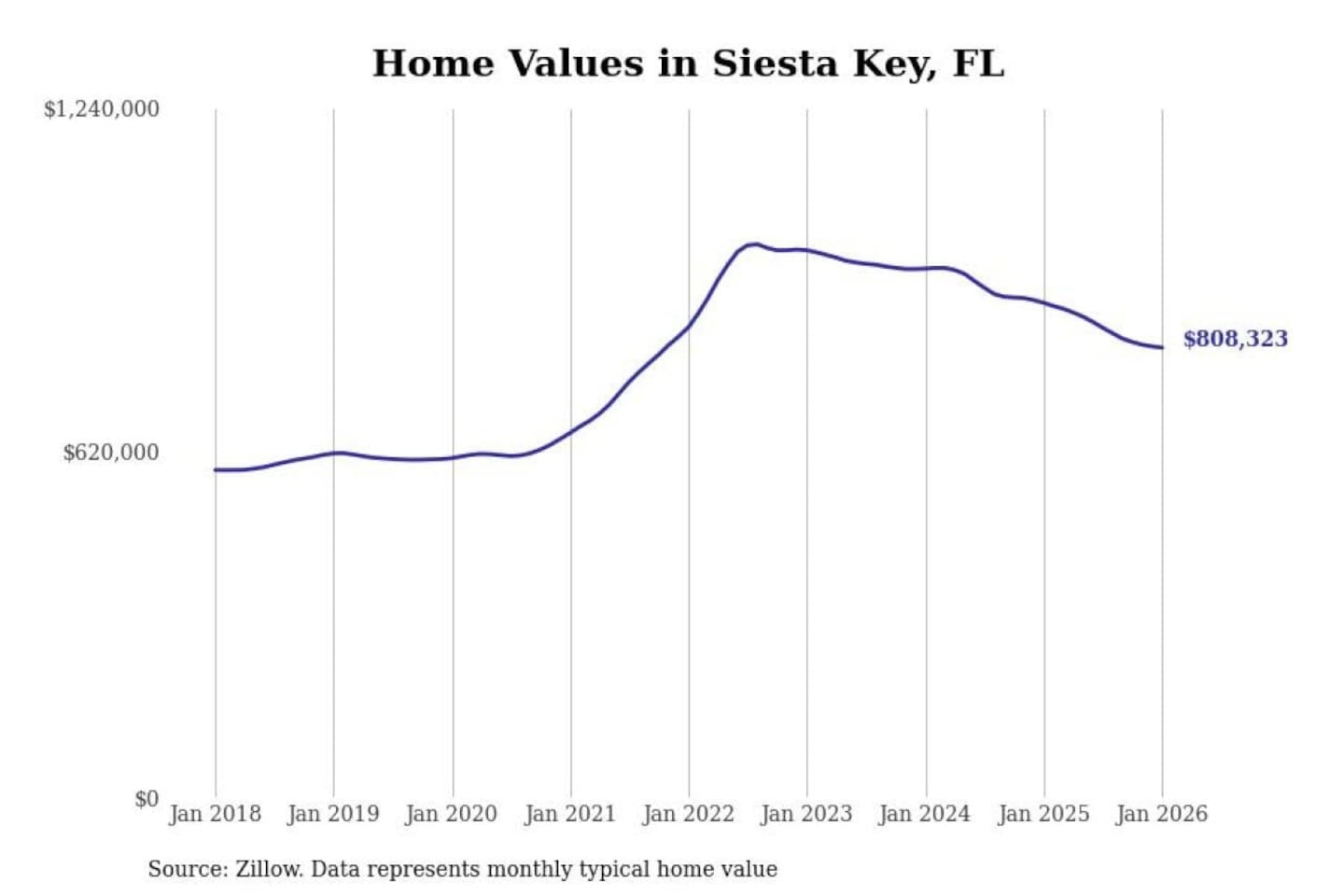 Stacker compiled a list of cities with the most expensive homes in the North Port-Sarasota-Bradenton, FL metro area using data from Zillow. Charts show the monthly typical home value since January 2018.