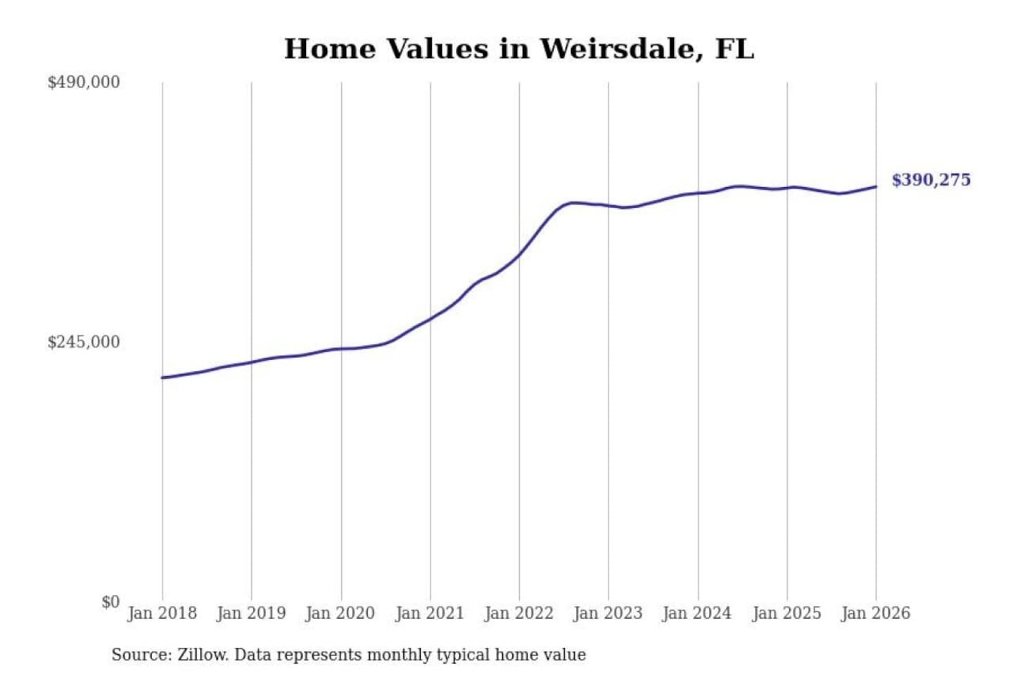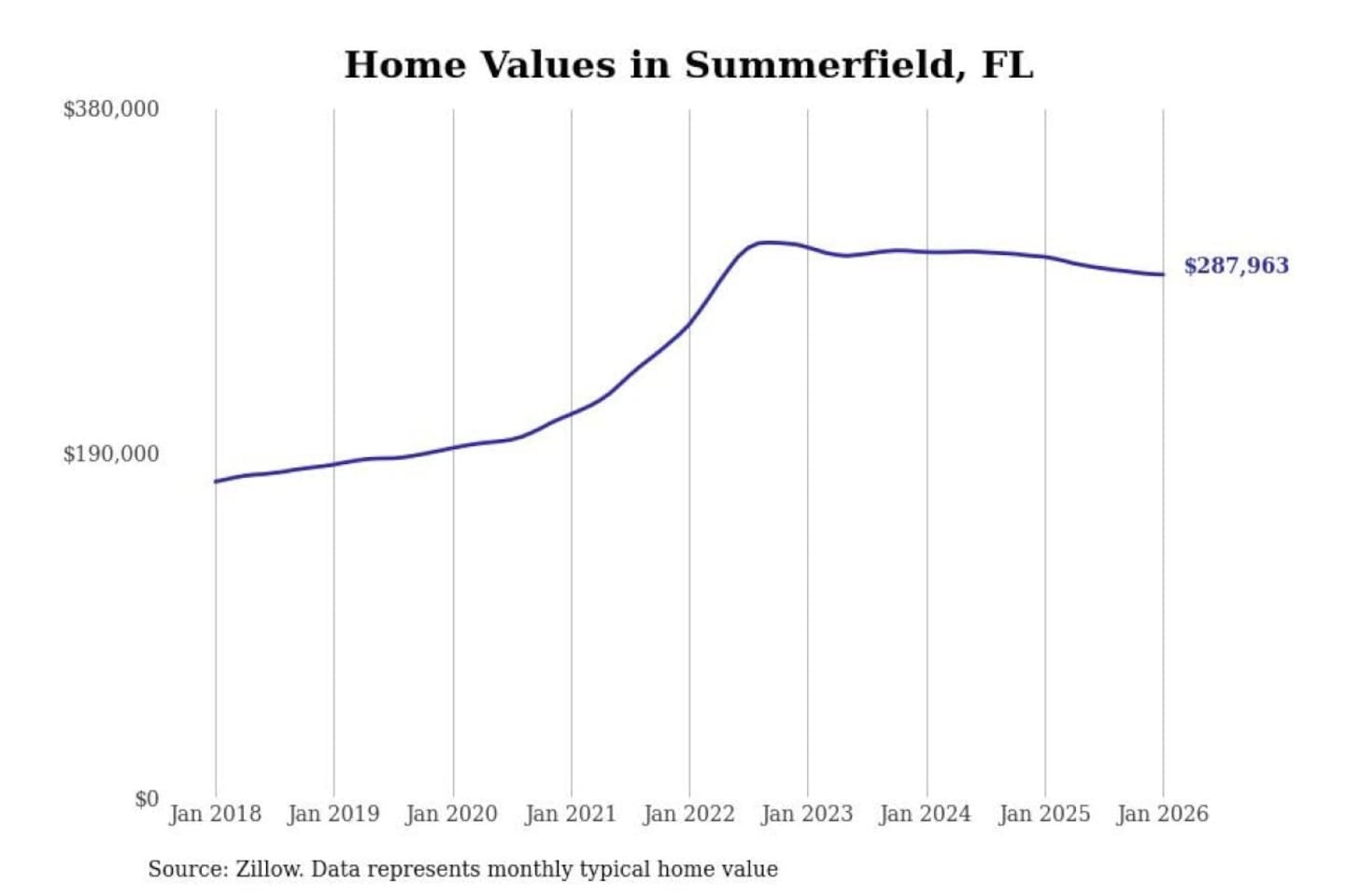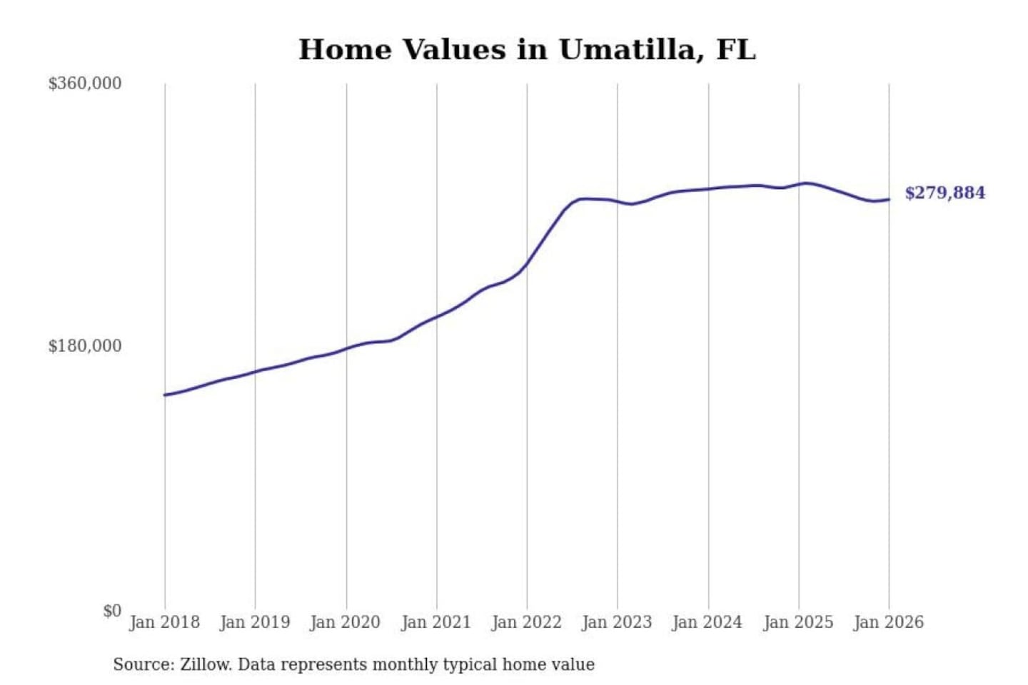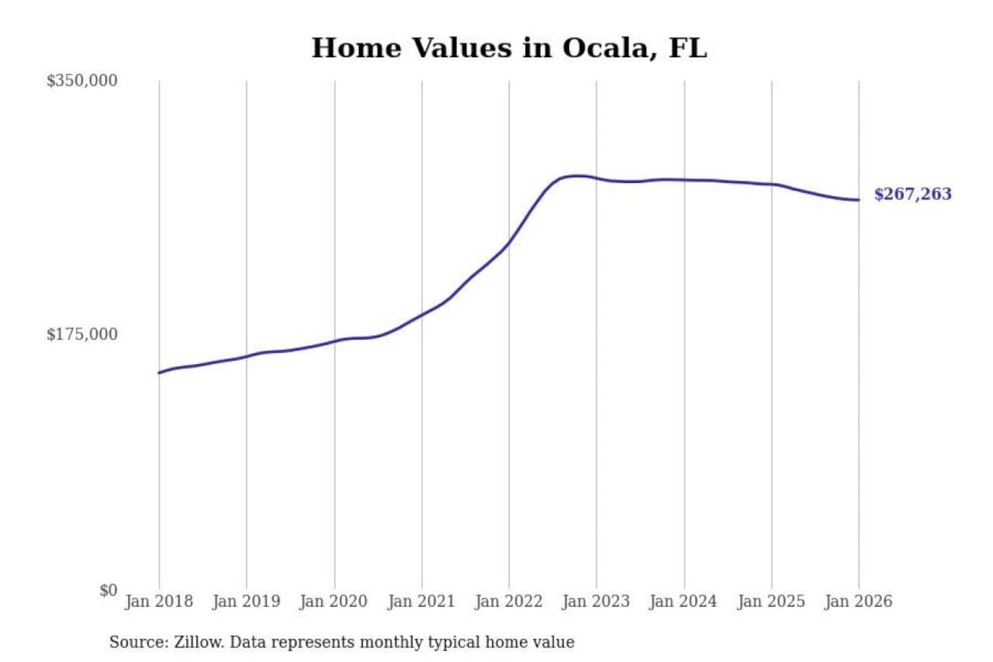 Stacker compiled a list of cities with the most expensive homes in the Ocala, FL metro area using data from Zillow. Charts show the monthly typical home value since January 2018.