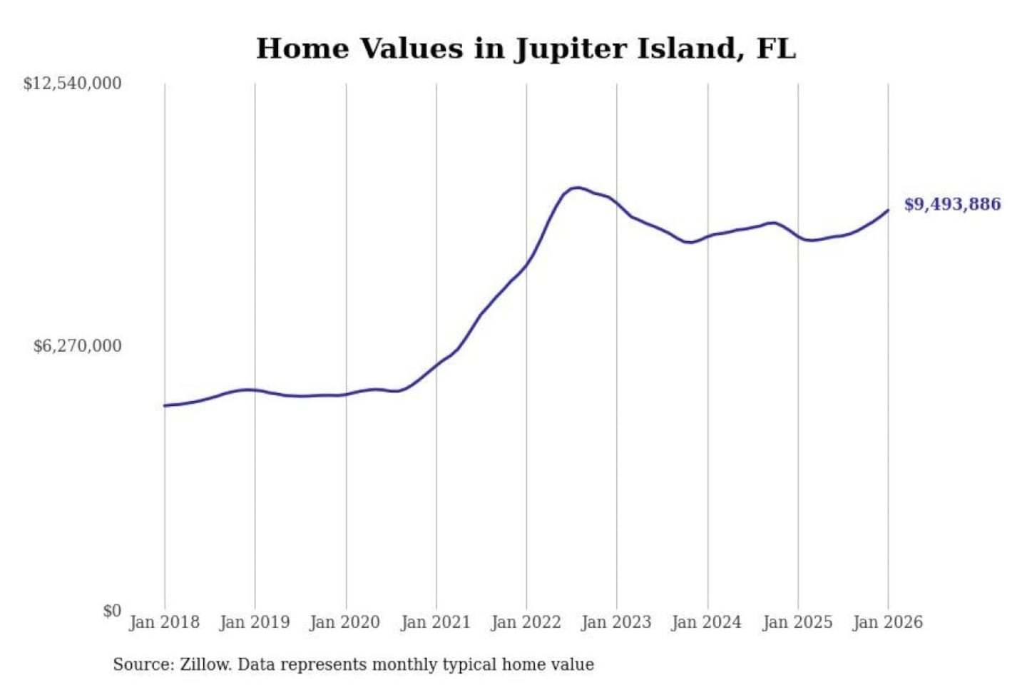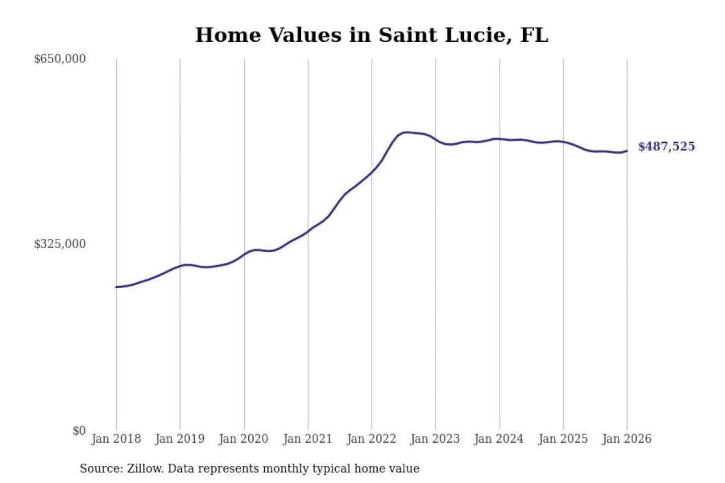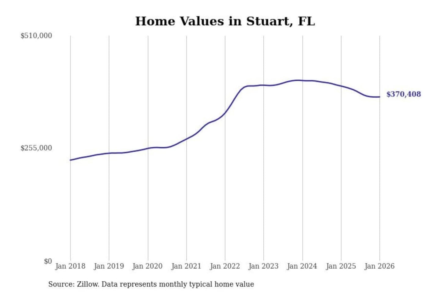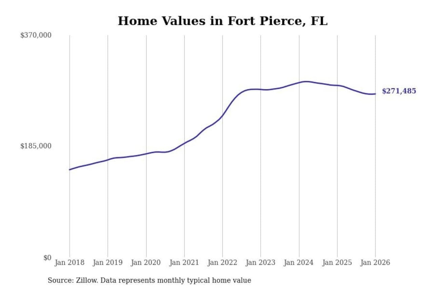 Stacker compiled a list of cities with the most expensive homes in the Port St. Lucie, FL metro area using data from Zillow. Charts show the monthly typical home value since January 2018.