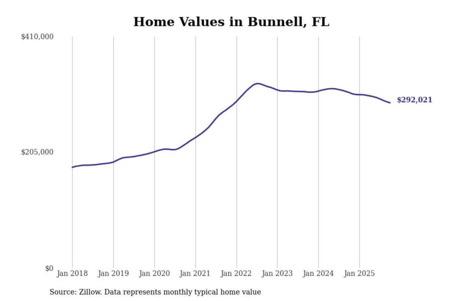 Stacker compiled a list of cities with the most expensive homes in the Deltona metro area using data from Zillow. Charts show the monthly typical home value since January 2018. All 22 cities and towns with data available were included in the list.