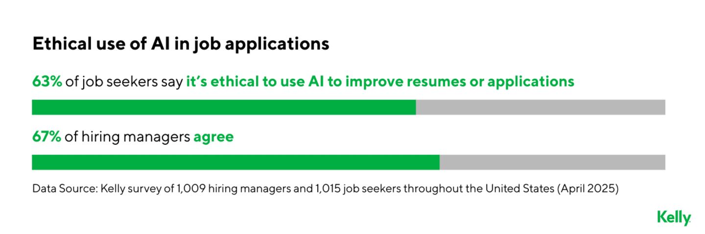 Another point of agreement is on artificial intelligence. Sixty-three percent of job seekers say it is ethical to use AI to improve resumes or applications, and 67 percent of hiring managers agree. Many of those same managers also use AI detection tools to screen applications.