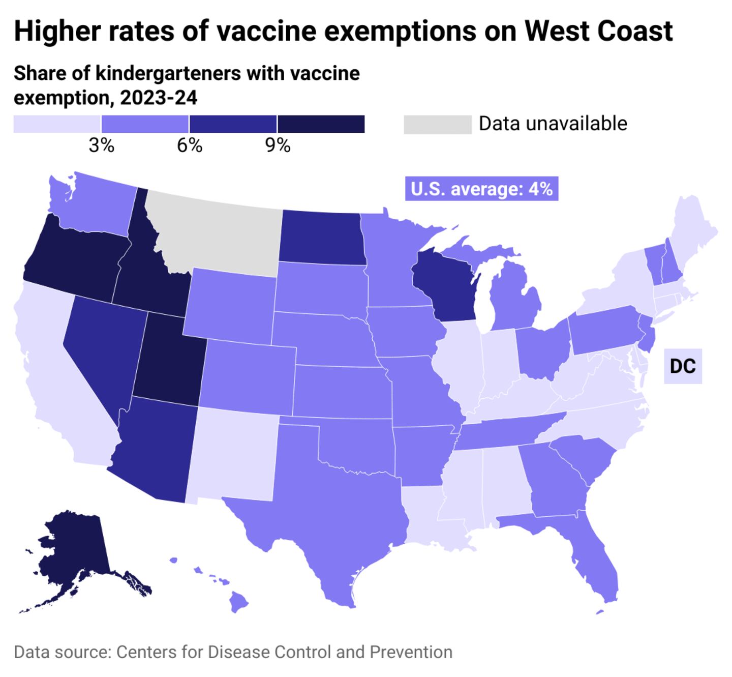 During the 2023-2024 school year, an average of 4% of kindergarteners' families across the U.S. requested exemptions—more than double the 2011-2012 school year. The highest numbers were seen in Western states like Idaho, Oregon, and Alaska, with a rate well above average at 14.3%. Mississippi, California, New York, and West Virginia had the lowest exemption rates in the nation, with each under 1%.
