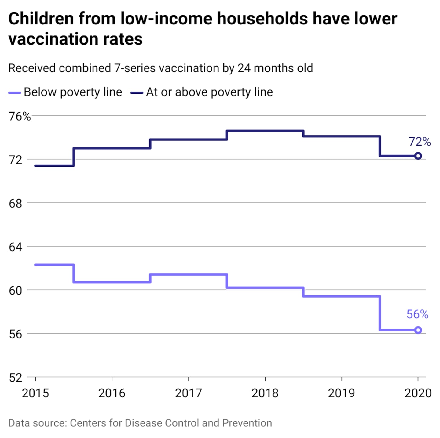 Children living below the poverty line receive the 7-vaccine series at a significantly lower rate than those who live above the poverty line, according to CDC data. This disparity has increased in recent years. While approximately 68% of all U.S. children born in 2020 received these critical vaccines by age 2, the completion rate was just over 56% for children who live below the poverty line—a notable decrease from the nearly 61% completion rate of those living below the poverty line who were born just five years earlier.