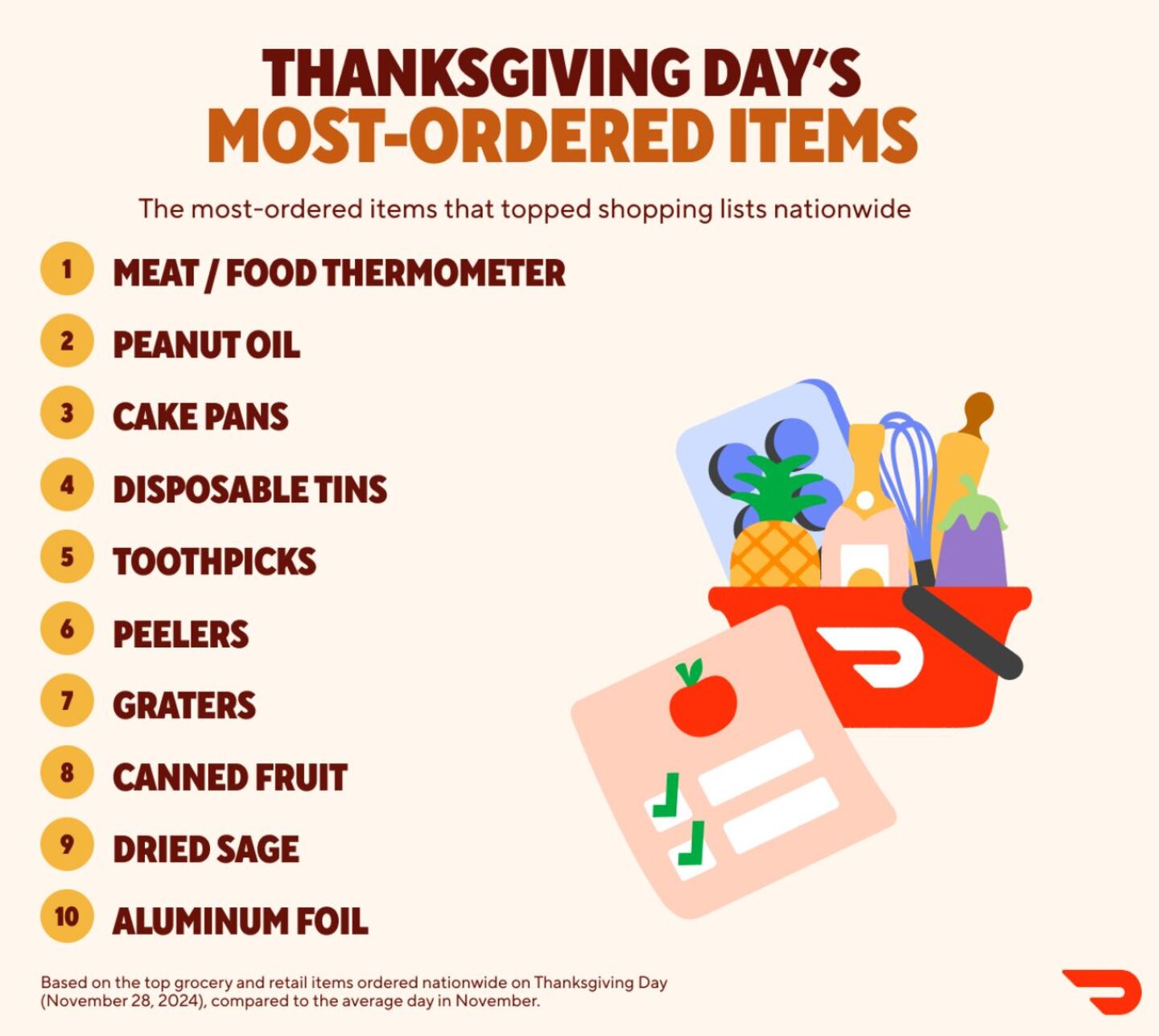 The day before Thanksgiving might just be the most stressful 24 hours of the holiday. Kitchens are chaotic, fridges are overflowing, and every cook and host alike suddenly realizes they’ve forgotten something essential. DoorDash grocery and retail data confirms the frenzy — Thanksgiving Eve is officially the biggest grocery delivery day of the year. Orders soar nearly 90% higher than an average day, as households rush to stock up before the feast.