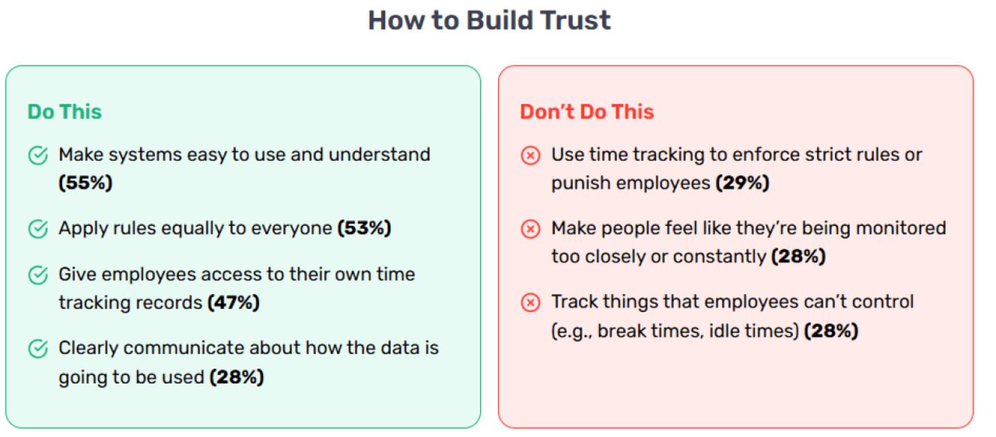 These findings highlight what employees want from time-tracking systems, and what risks can arise when those expectations aren’t met. Time tracking works best when it’s clear, fair, consistent, and built with employees in mind. This article explores what workers say builds trust versus what feels like micromanagement, and how companies can get it right.