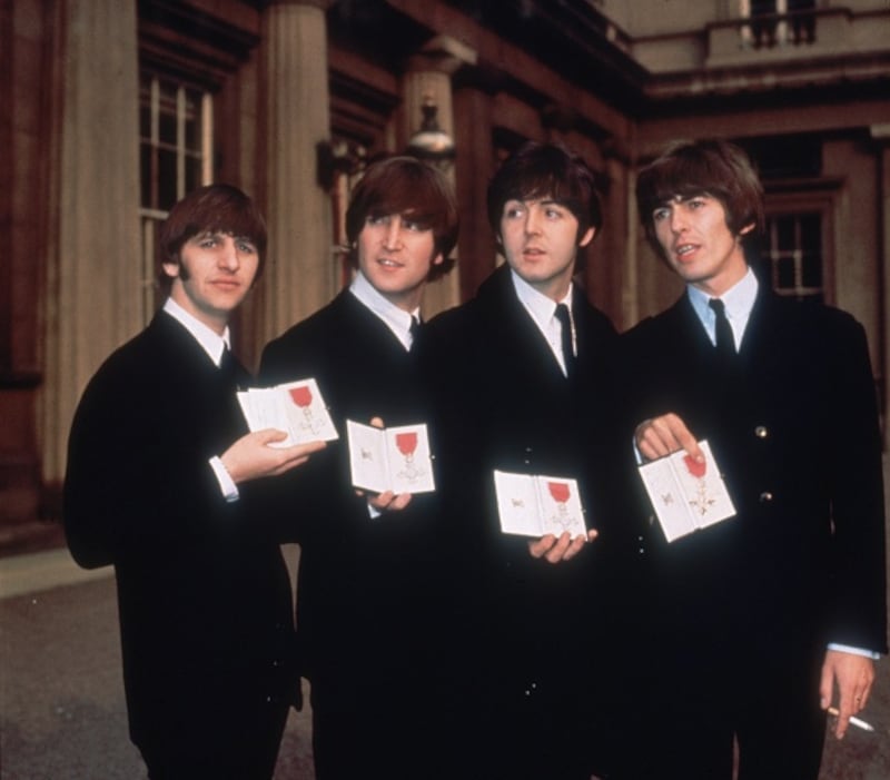 Remembering John Lennon British pop group The Beatles, from left to right; Ringo Starr, John Lennon (1940 - 1980), Paul McCartney and George Harrison (1943 - 2001), outside Buckingham Palace, London, after receiving their MBEs (Member of the Order of the British Empire) from the Queen, 26th October 1965. (Photo by Hulton Archive/Getty Images) (Hulton Archive/Getty Images)
