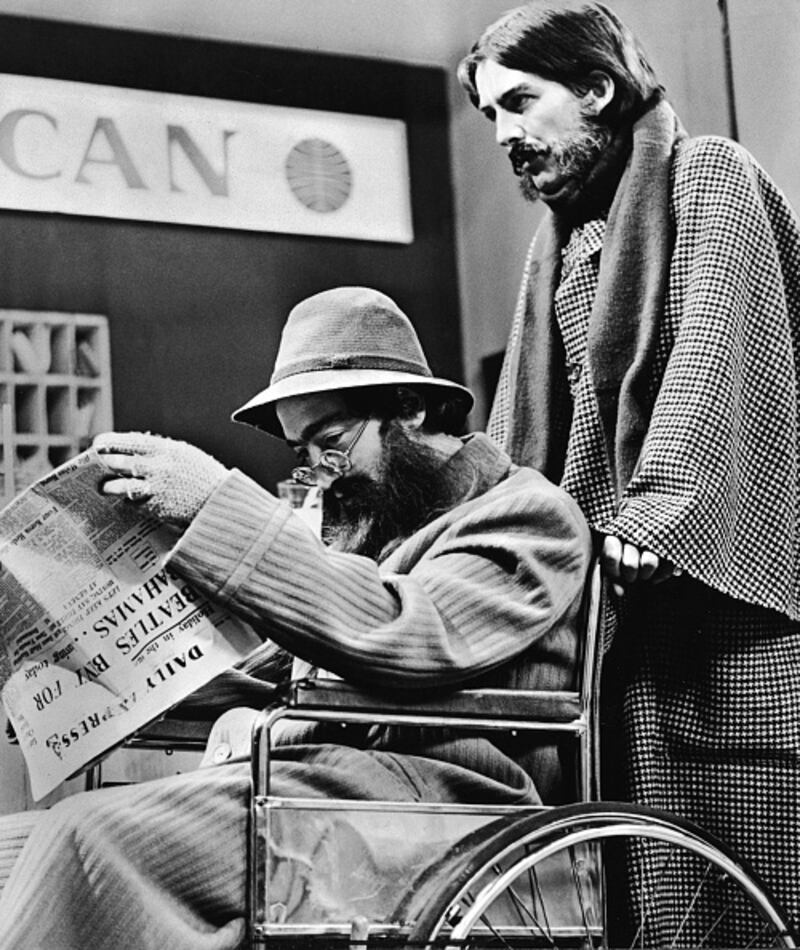 Remembering John Lennon George Harrison (1943 - 2001) (right) pushes John Lennon (1940 - 1980), both of the British pop group the Beatles, in a wheelchair as they travel in unconvincing disguises past a Pan American airline banner, July 20, 1965. (Photo by Express Newspapers/Getty Images) (Express Newspapers/Getty Images)