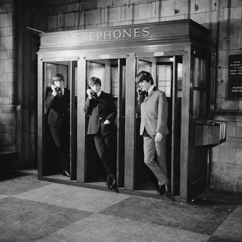 Remembering John Lennon Singer John Lennon (1940 - 1980), drummer Ringo Starr, and guitarist George Harrison (1943 - 2001) in telephone kiosks at Marylebone Station while filming musical comedy film 'A Hard Day's Night', London, March 1964. (Photo by Kaye/Daily Express/Hulton Archive/Getty Images) (Kaye/Getty Images)