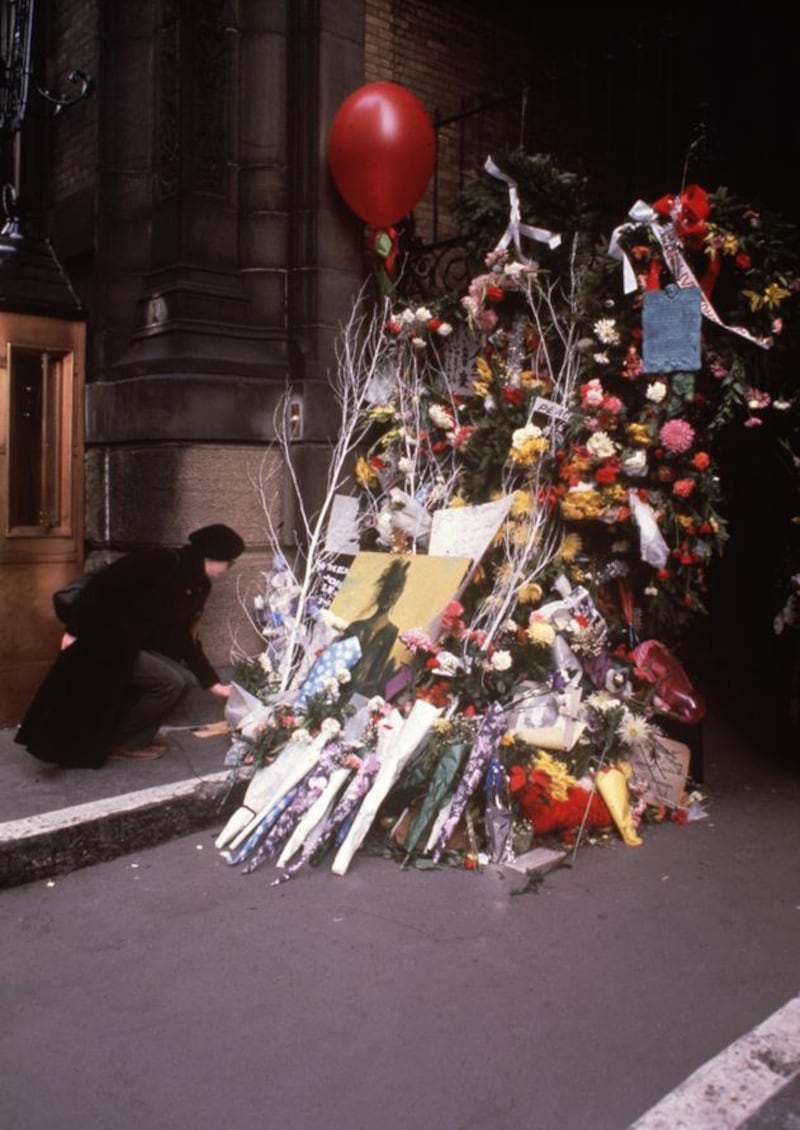 In this 1980 file photo, a woman leaves flowers at a make shift memorial outside the Dakota apartment house where John Lennon was shot and killed on Monday, Dec. 8, 1980 in New York.