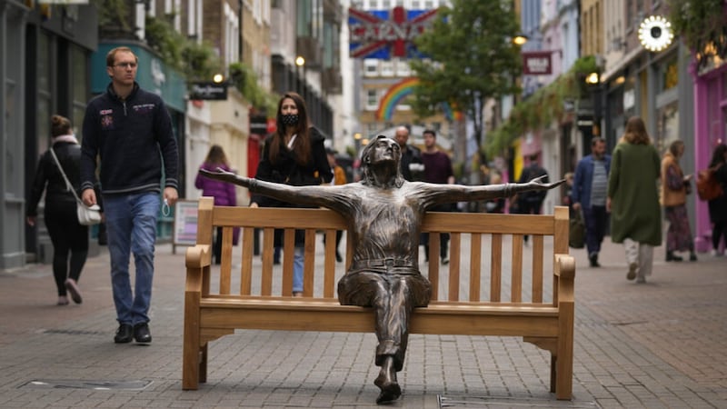 Remembering Lennon: A life-size sculpture of John Lennon entitled 'Imagine', was moved to Carnaby Street in London on Oct. 8, 2021 -- a day before what would have been Lennon's 81st birthday. (Kirsty Wigglesworth/Associated Press )