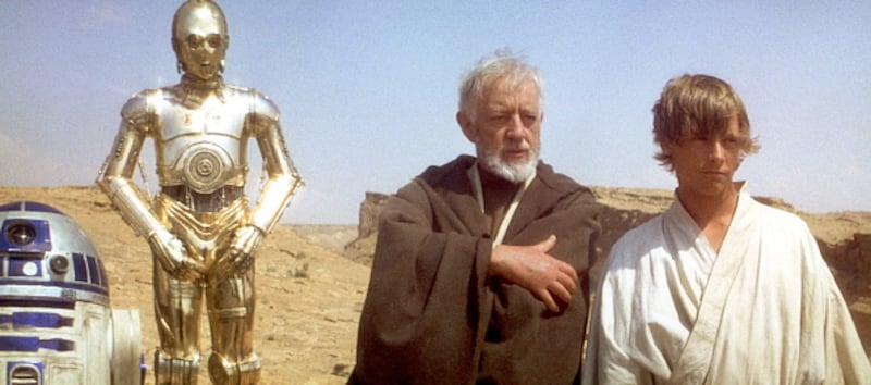 British actors Anthony Daniels, Alec Guinness and American Mark Hamill on the set of Star Wars: Episode IV - A New Hope written, directed and produced by Georges Lucas. (Photo by Sunset Boulevard/Corbis via Getty Images)
