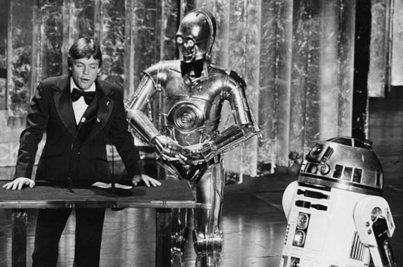 Actor Mark Hamill presenting an award with his Star Wars co-stars C3PO and R2D2, at the 50th Academy Awards, Los Angeles, April 3rd 1978. (Photo by Archive Photos/Getty Images)