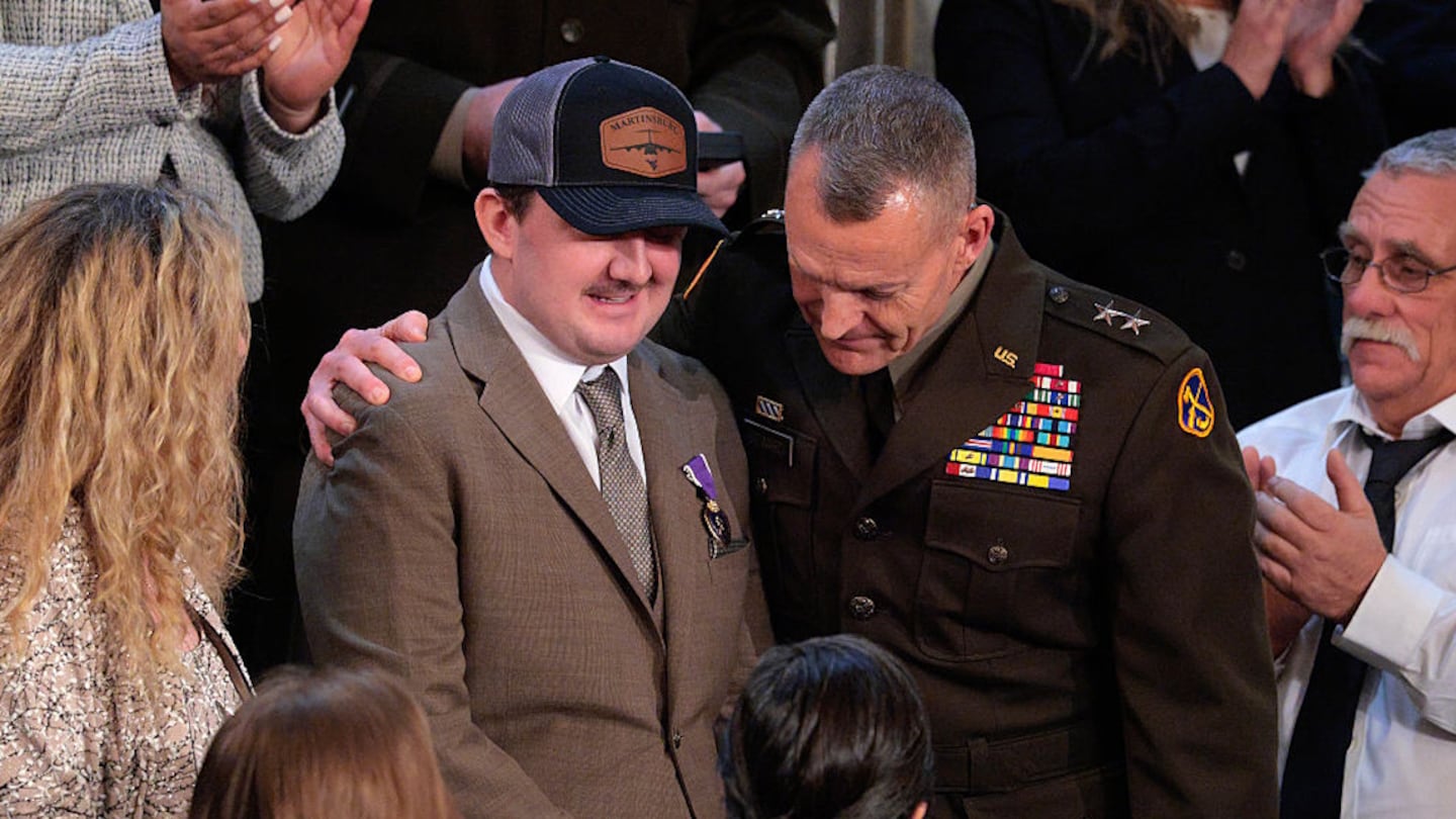 “Nice to see -- he’s a good-looking guy. Nice to see you. Thanks, Andrew. Thank you very much. So, Andrew, while you’re up, now I’m going to ask a highly respected General James Seward to present Staff Sgt. Andrew Wolf and the great family of Sarah Beckstrom with the award created by our late great president, George Washington himself.