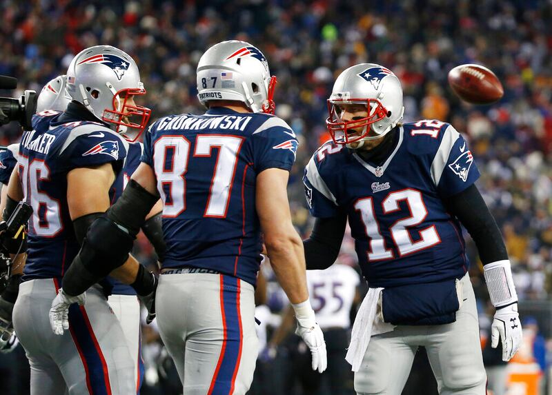 Tom Brady FILE - In this Jan. 10, 2015, file photo, New England Patriots tight end Rob Gronkowski (87) celebrates his touchdown catch from Patriots quarterback Tom Brady (12) in the second half of an NFL divisional playoff football game against the Baltimore Ravens in Foxborough, Mass. Brady has engineered nine fourth-quarter comebacks in the playoffs but just four of those came at home. Perhaps the most memorable of those New England comebacks outside of the Tuck Rule game, game on Jan. 10, 2015, against Baltimore. (AP Photo/Elise Amendola, File) (Elise Amendola/AP)