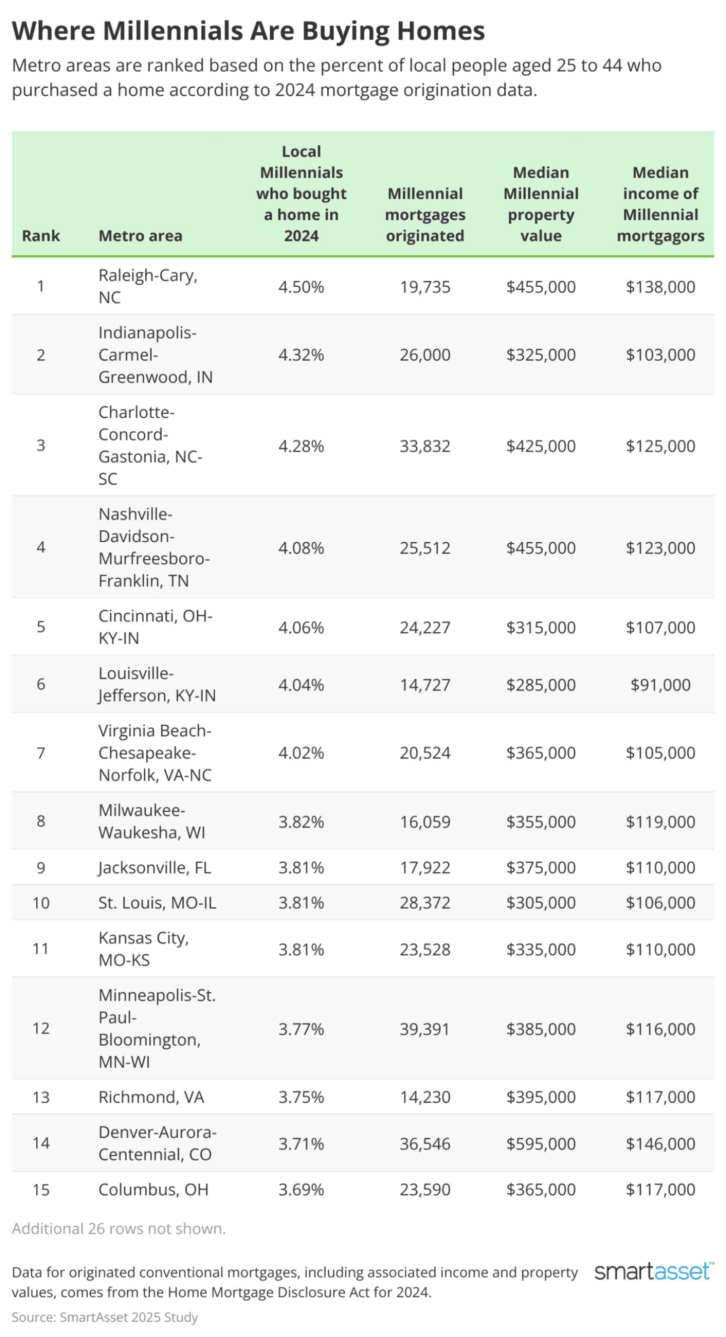To find where Millennials are buying homes at the fastest rates, SmartAsset reviewed Home Mortgage Disclosure Act data for 2024. Specifically, originated mortgages for people between age 25 and 44 were considered, relative to the size of the local population of that same age bracket in 2023 according to U.S. Census Bureau data. The median income of new Millennial homeowners, as well as subject property value, were also considered.